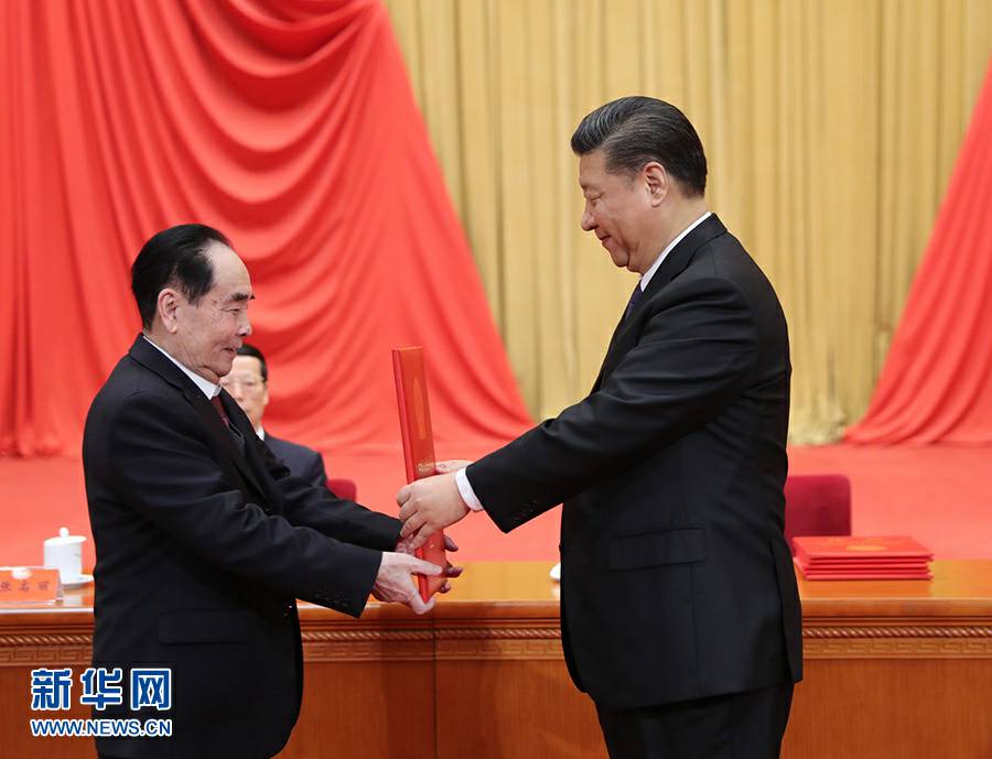 1月8日,国家科学技术奖励大会在北京人民大会堂隆重举行。中共中央总书记、国家主席、中央军委主席习近平向获得2017年度国家最高科学技术奖的南京理工大学王泽山院士颁发奖励证书。新华社记者 鞠鹏 摄