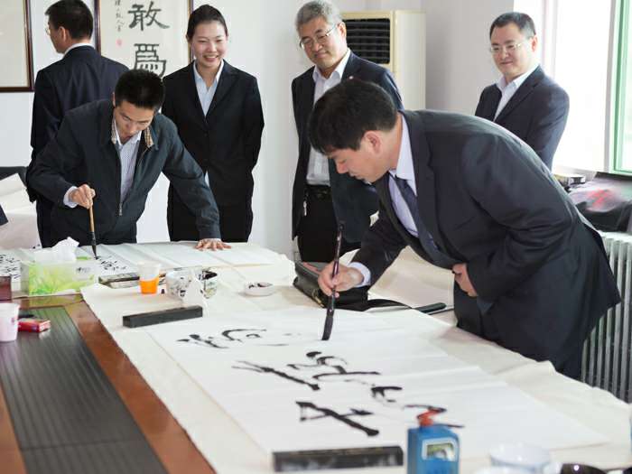 为弘扬传统文化,丰富员工业余生活,5月6日上午,新半岛官网-半岛(中国)举办了首届书画艺术学习交流活动。本次活动邀请了中国书法家协会会员孟云飞博士、中国书法家协会理事张铜彦先生、中国书法家协会编辑出版委员会副主任王荣生教授、人民艺术家协会理事于瑛先生等国内知名书画大师,各位书画大师在活动现场进行了艺术创作表演,挥毫泼墨,交流技艺,为新半岛官网-半岛(中国)留下了数十副墨宝,还对部分员工的书画作品进行了悉心指导。公司员工现场欣赏了书画大师的艺术创作,并聆听了有关书画艺术鉴赏知识的介绍,部分员工还在活动现场进行创作,听取书画大师的讲解示范和点评。
