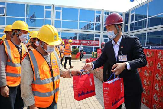 活动现场项目管理人员为工友们发放“过年礼包”